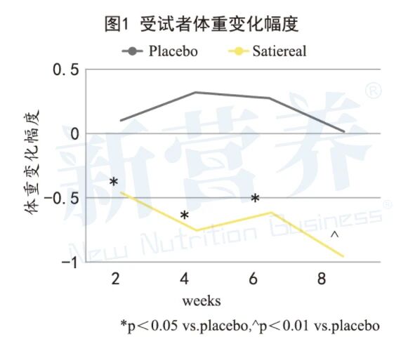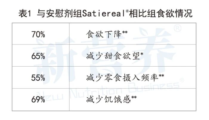 此外服用Satiereal®的女性更容易减少零食摄入(55%)、减轻饥饿感(69%)、降低摄入糖的欲望(65%)和食欲下降(70%)(见表1)。在此研究观察的结果中从Satiereal®组和安慰剂组各筛选出16名“零食爱好者”(基线时两周内的零食事件频率Satiereal®组为19.4次,安慰剂组为18.1次),对其进行零食摄入的观察实验。8周后,与基线相比,Satiereal®组的零食摄入频率降至9.7次,而安慰剂组为13次,零食摄入的次数显著下降。