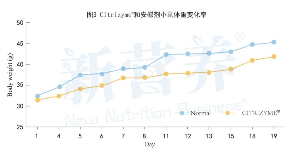 一篇针对Citrizyme®的动物试验,以高油脂饲料喂食成长中的小鼠,诱导小鼠肥胖,同时给予Citrizyme®和安慰剂,检测小鼠体重变化率。结果显示经高油脂饲料喂养的小鼠,体重随着时间上升,第19天时体重增加率达到39%;而使用Citrizyme®的小鼠,体重增加率减少达7%。(见图3)