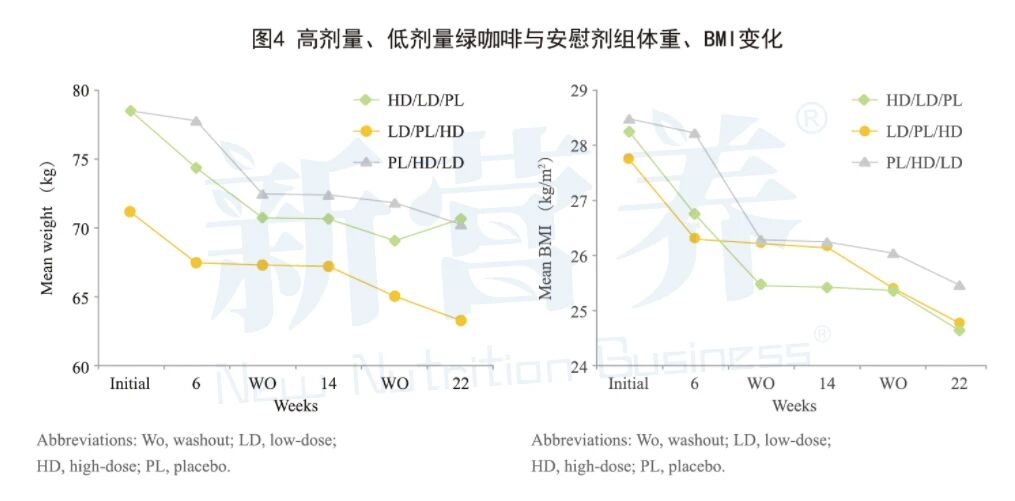 在一项针对16名肥胖患者的随机双盲对照交叉试验中,8名男性和8名女性肥胖受试者分别进行6周高剂量绿咖啡/2周洗脱期/6周低剂量绿咖啡/2周洗脱期/6周安慰剂的实验过程。在22周的交叉研究中,三分之二的受体在服用GCA阶段体重、BMI、体脂百分比和心率均有统计学意义上的显著降低,但收缩压和舒张压总体上没有显著变化。随着绿咖啡提取物服用剂量越高,体重变化和平均BMI下降速率越大,而对照组则保持平缓。(见图4)