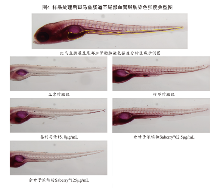 减少脂肪入血吸收:直观的斑马鱼实验[5]显示(来源余甘子浓缩粉Saberry®抑制脂肪吸收功效检测报告),经Saberry®余甘子处理(125μg/ml)后,脂肪从肠道向血管运输的强度大幅降低了51%(p<0.001)。这表明它能在肠道直接结合或干扰脂肪的吸收,减少脂肪进入循环系统。(见图4)