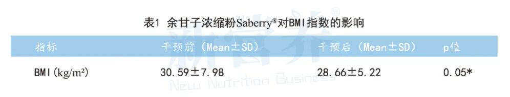 在一项针对24名非酒精性脂肪肝(NAFLD)患者的人体临床测试[6]中(来源:Food Proc Nutr Sci 2(2):55-64.),口服500毫克/天的余甘子浓缩粉Saberry®,可以有效改善BMI指数,测试周期为90天。(见表1)