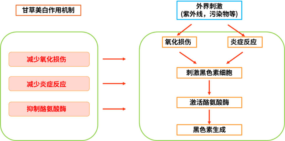 现代研究表明,甘草含有甘草酸、甘草次酸、光甘草定等活性成分,对于光损伤、氧化应激和炎症反应对黑色素细胞的刺激有积极的影响,减少其分泌黑色素的概率。同时,亦可通过抑制黑色素合成关键酶——酪氨酸酶的活性,降低黑色素水平(图7)。
