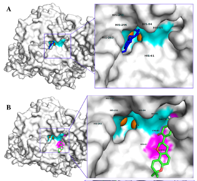 图8:A:无光甘草定的情况下,酪氨酸(深蓝色)可以进入催化反应中心(天蓝色),逐步转化为黑色素;B:在有光甘草定(草绿色)的情况下,催化反应中心入口被锁住,酪氨酸无法进入