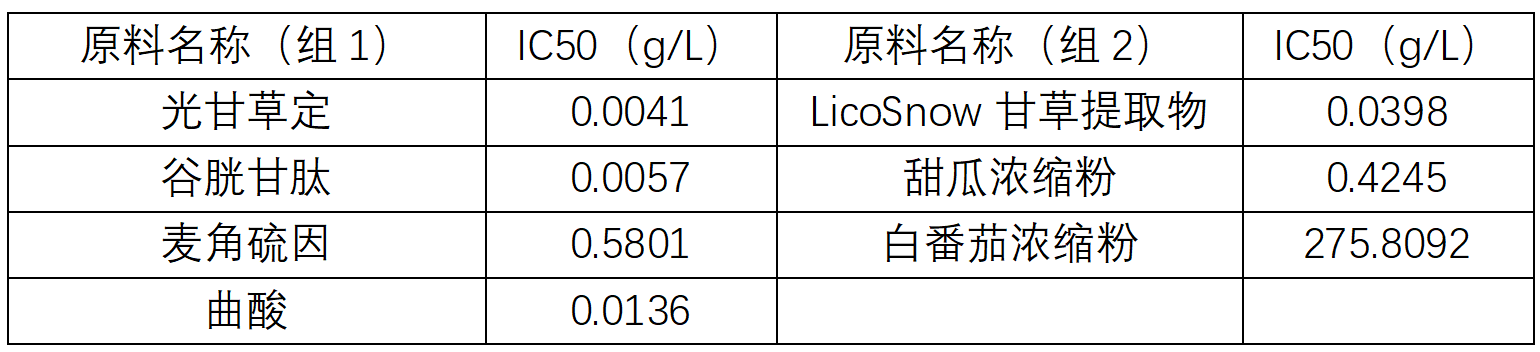 考虑到公平性,实验对比分为两组:第一组均为高纯度原料(纯度>98%),包括光甘草定、谷胱甘肽、麦角硫因,以及曲酸(酪氨酸酶抑制剂阳性对照),共4种;第二组均为植物提取物,包括LicoSnow甘草提取物(含4%光甘草定)、甜瓜浓缩粉(含SOD)和白番茄浓缩粉(含六氢/八氢番茄红素),共3种。各原料IC50值见表2。
