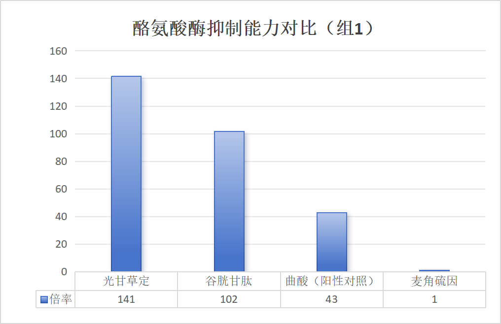 图9:光甘草定、谷胱甘肽、曲酸(阳性对照)和麦角硫因的酪氨酸酶抑制能力对比,以麦角硫因为参照物