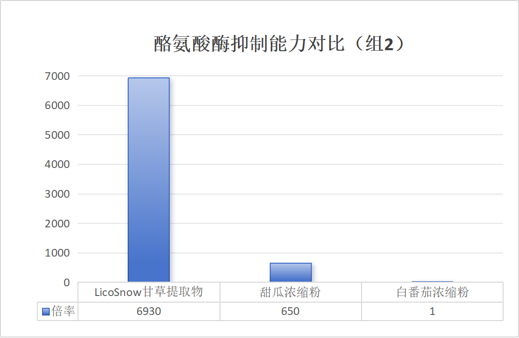 图10:LicoSnow甘草提取物、甜瓜浓缩粉和白番茄浓缩粉的酪氨酸酶抑制能力对比,以白番茄浓缩粉为参照物