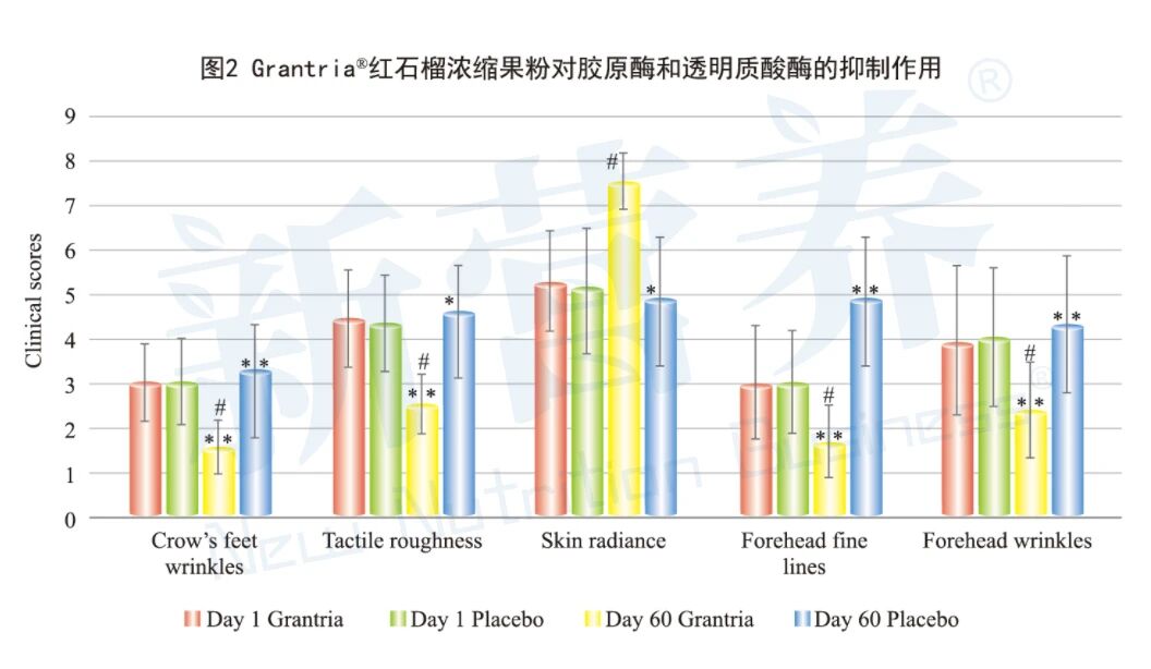 Grantria®的卓效不仅建基于明确的作用机制,还得到临床的验证。一项随机双盲对照研究中,80名35-65岁健康成年女性分成两组,实验组每天服用300mg的Grantria®,持续60天,以脸部各分区的皱纹细纹、皮肤弹性、色泽、等为指标,由皮肤科医生进行评估并结合专业设备检测,对比干预前后的变化。研究结果表明,Grantria®在60天内显著减少了鱼尾纹(51%)、触感粗糙度(43%)、额头细纹(45%)、额头皱纹(40%),并改善了皮肤的光泽度(43%),相较于安慰剂组表现更佳(见图2)。其它美肤指标,如毛孔、斑点和皮肤弹性等,也观察到有显著变化,与干预前相比,实验组在肤色均匀度、皮肤保湿、弹性和紧致度方面均有显著提升,同时观察到酪氨酸酶生物标志物水平下降了3%,且在实验过程中未报告任何不良反应。