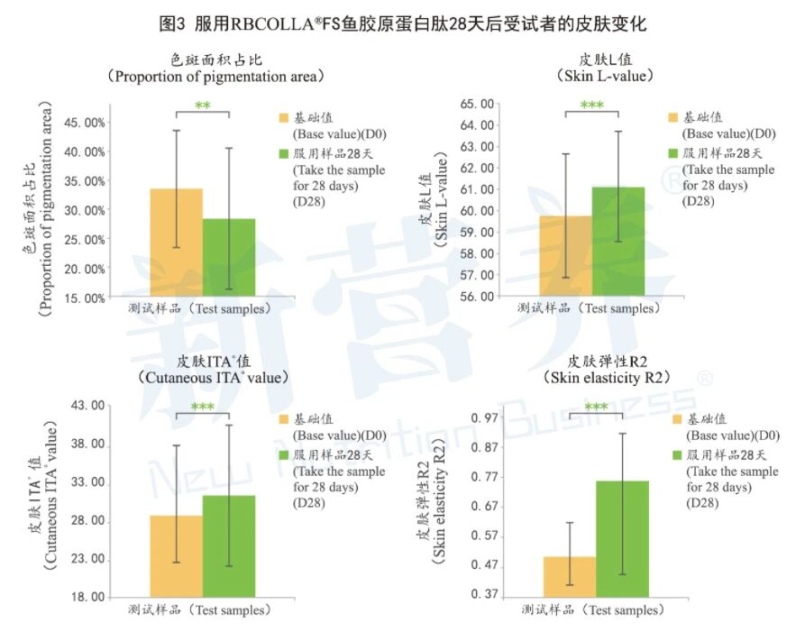 结果显示,连续服用RBCOLLA®FS鱼胶原蛋白肽28天后,受试者的色斑面积从33.45%降至28.32%,平均下降率达15.34%,黄褐斑、雀斑等色素沉着得到改善;皮肤L值(亮度指标)从59.79提升至61.10,上升率2.19%,肤色明显变白;ITA值(肤色亮度分类指标)从28.94提升至31.60,上升率9.19%,皮肤光泽度显著增强;皮肤弹性R2值由0.51上升到0.76,平均上升率为 47.71%,最高上升率114.69%,有效提高皮肤弹性。试验期间,受试者100%反馈无皮肤不良反应,对产品的温和性与效果满意度满分。
