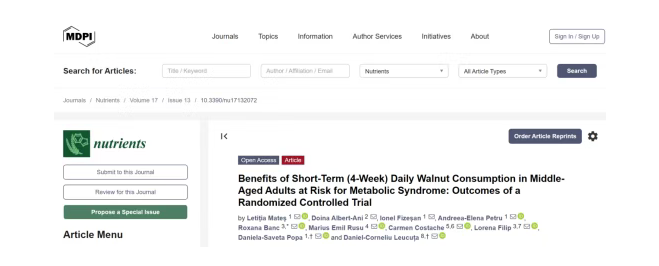 [7]Letiția Mateș et al. Benefits of Short-Term (4-Week) Daily Walnut Consumption in Middle-Aged Adults at Risk for Metabolic Syndrome: Outcomes of a Randomized Controlled Trial.Nutrients 2025, 17(13), 2072; https://doi.org/10.3390/nu17132072