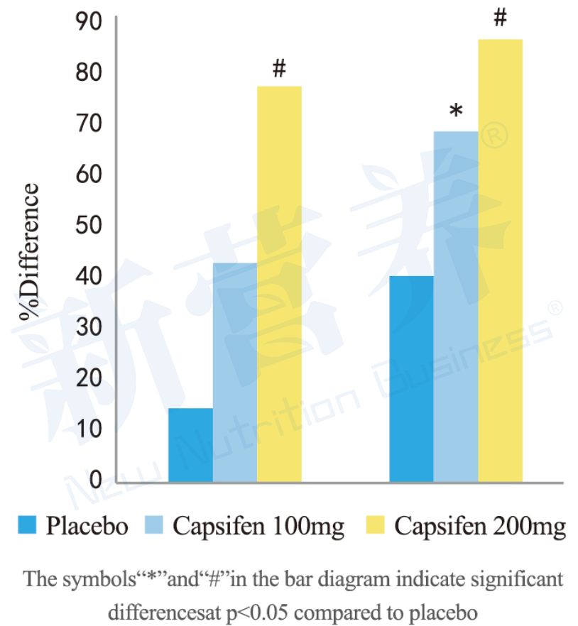 临床研究评估了补充Capsifen™(100mg/天和200mg/天)在28天内对静息能量消耗(REE)和运动后能量消耗的影响。结果显示:CaF100使静息能量消耗增加了195千卡(VS安慰剂,增加11倍),CaF200则增加了300千卡(增加16倍);运动后,CaF100使能量消耗增加了277千卡(增加25倍),而CaF200则增加了331千卡(增加30倍)。