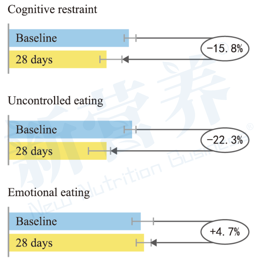 在一项临床研究中,系统性地研究了Capsifen™(200mg/天,28天)对食欲控制的影响,通过三因素饮食问卷(TFEQ)和营养食欲问卷(CNAQ)评价受试者的饮食行为。结果显示:受试者补充Capsifen™之后,在认知抑制维度(个体通过理性思考控制进食冲动、食量的能力)减少了22.3%进食行为,在失控进食维度(进食时主观上想停止却无法自控)减少了15.8%的进食行为,显著降低食欲。
