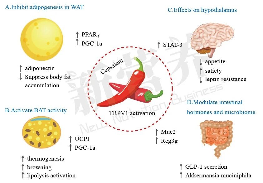 大量的流行病学和动物试验研究证据表明:TRPV1(瞬时感受器电位香草酸受体1)在调节整个身体健康方面发挥着重要作用,包括体重控制,葡萄糖和脂质代谢以及心血管系统调控等;TRPV1由于其对能量代谢和平衡的影响而被认为是预防肥胖的潜在靶标。