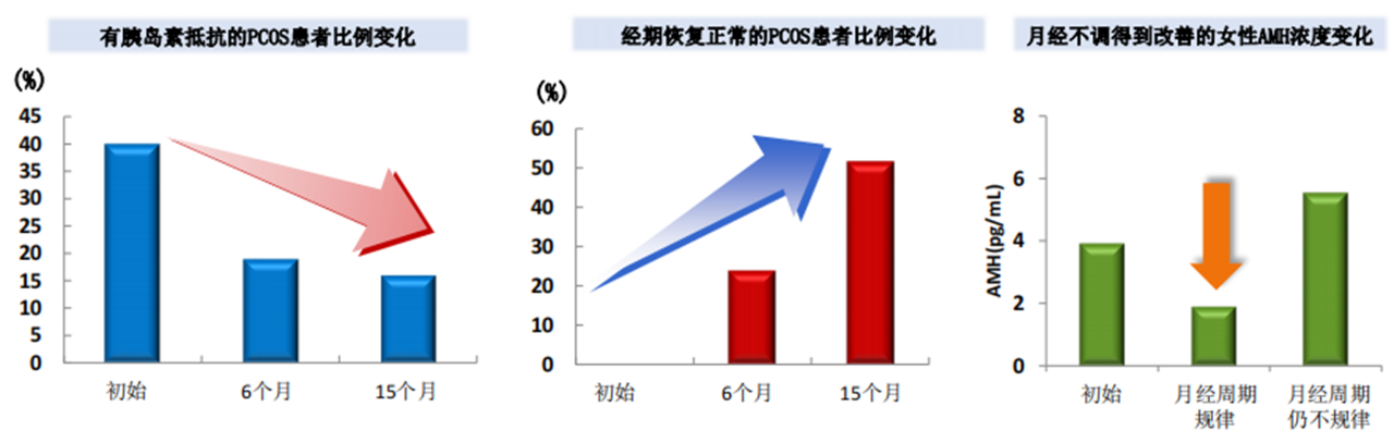 通过观察DCI受试者(根据不同体重服用1-1.5g/日,连续服用6个月-15个月),发现月经稀发及闭经者的比例随月经周期规律的增加而减少,服用DCI后,AMH月经周期得到改善的PCOS组血清中的AMH(抗苗勒管激素)水平显著降低,有胰岛素抵抗的受试者比例下降。