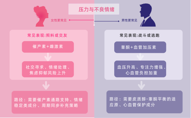 女性则需要催产素通路支持、情绪稳定类成分、周期同步补充策略