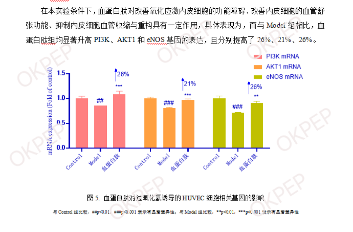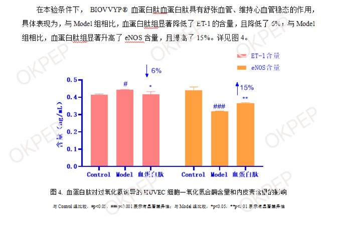 经第三方检测实验得出评估结论:“汉诺森 BIOVVYP® 血蛋白肽具有维持心血管稳态益处,具体表现为调节 HUVEC 细胞中 ET-1 与 eNOS 的含量平衡,且升高 PI3K、AKT1、eNOS 的相对基因表达量”。