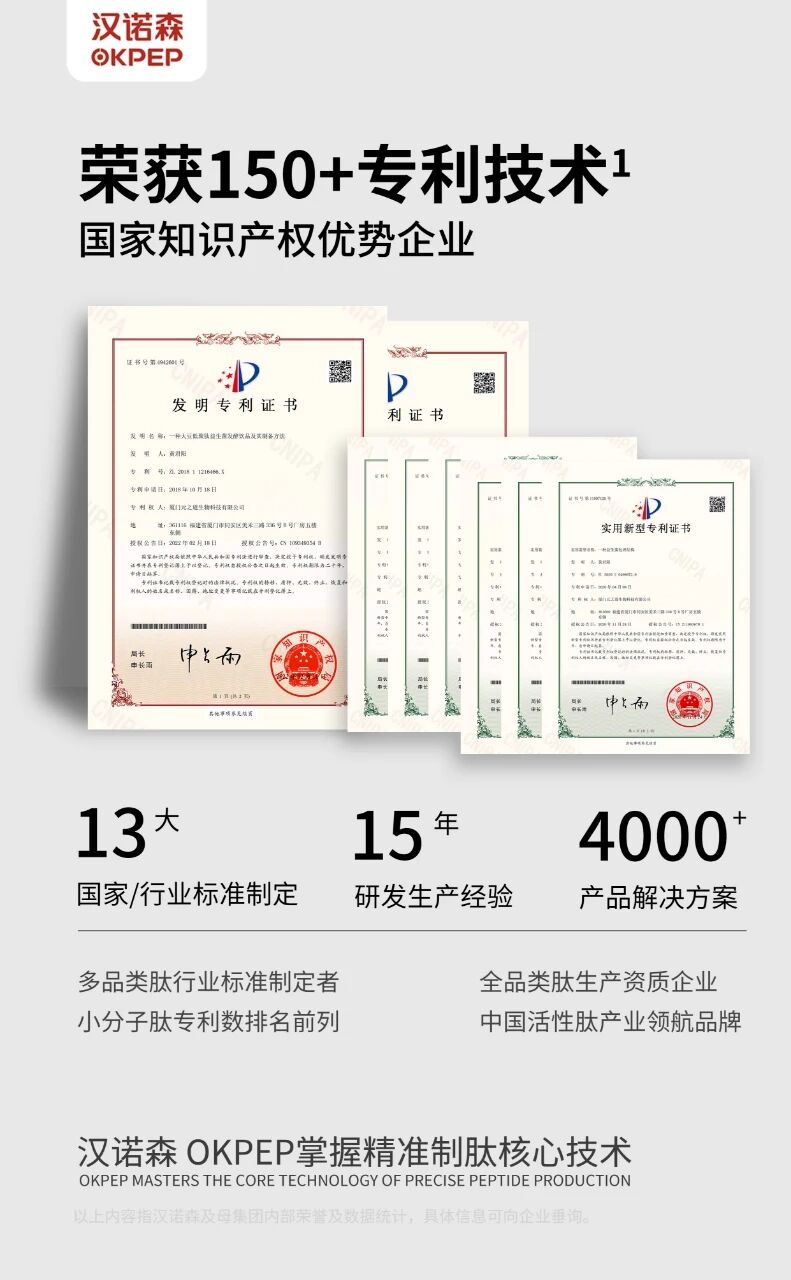 汉诺森(OKPEP)2010年成立,是掌握精准制肽核心技术的国家高新技术企业,专注技术创新与产品研发,推动活性肽产业发展;拥有超150+专利,参与13项国家/行业标准制定,独创海洋低聚肽开发技术获国际先进认证,精准活性广泛应用于大健康等领域,为全球客户提供科学高效的功能肽解决方案。
