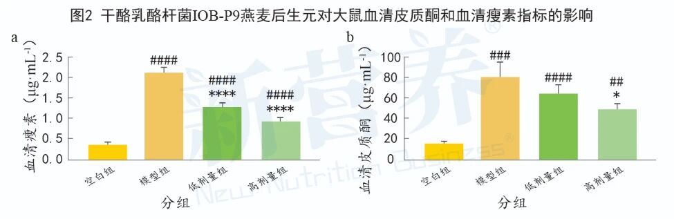 图2 干酪乳酪杆菌IOB-P9燕麦后生元对大鼠血清皮质酮和血清瘦素指标的影响