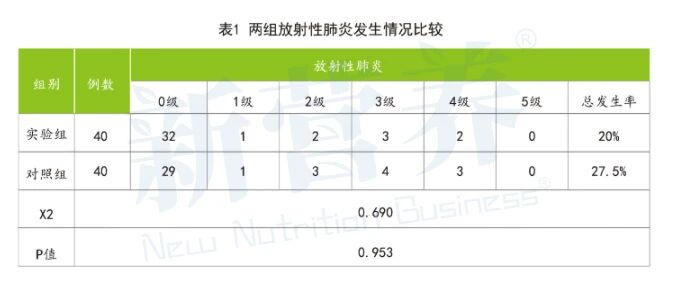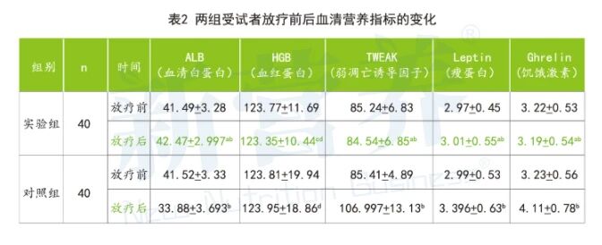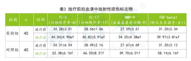 酒精进入肝脏后,会诱导肝脏产生炎症反应和氧化应激,导致肝细胞损伤和肝功能异常。岩藻多糖具有显著的抗炎和抗氧化作用,能够直接抑制酒精诱导的肝脏炎症和氧化损伤。在放射性损伤模型中[2],岩藻多糖显著降低促炎因子(IL-6、TNF-α、IL-1β)和肝损伤标志物(ALT、AST),减轻放射性肝炎和肺炎。临床数据显示,实验组放射性肺炎发生率(20%)低于对照组(27.5%),肝功能指标显著改善。除血红蛋白外,其他指标具统计学意义,实验组营养指标更优;干预之后血清中放射性损伤标志物水平明显下降。(见表1、2、3)