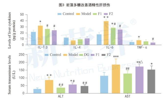在酒精性肝损伤研究方面,以大鼠酒精性肝损伤模型展开8周干预实验[3]。结果显示,BMSFu®岩藻多糖能显著降低谷丙转氨酶(ALT)和谷草转氨酶(AST)水平,助力肝功能恢复。病理层面,肝细胞肿胀、脂肪变性等不良状况得到明显缓解。同时,它还能调节肠道菌群,增加普雷沃菌、厚壁菌等有益菌,减少梭形杆菌等有害菌,多管齐下守护肝脏。(见图3)
