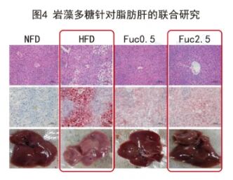 针对酒精性脂肪肝(NAFLD),采用高脂饮食诱导的非酒精性脂肪肝大鼠模型,给予岩藻多糖(100mg/kg)联合二甲双胍(200mg/kg)进行4周干预[4]。实验发现,该组合能降低肝酶(ALT、AST)、总胆固醇和甘油三酯水平,抑制炎症因子(TNF-α、IL-1β、MMP-2)的释放,改善胰岛素抵抗,增强胰岛素敏感性。在肠道菌群调节上,普拉梭菌、乳酸杆菌、双歧杆菌等有益菌的数量也有所增加。(见图4)