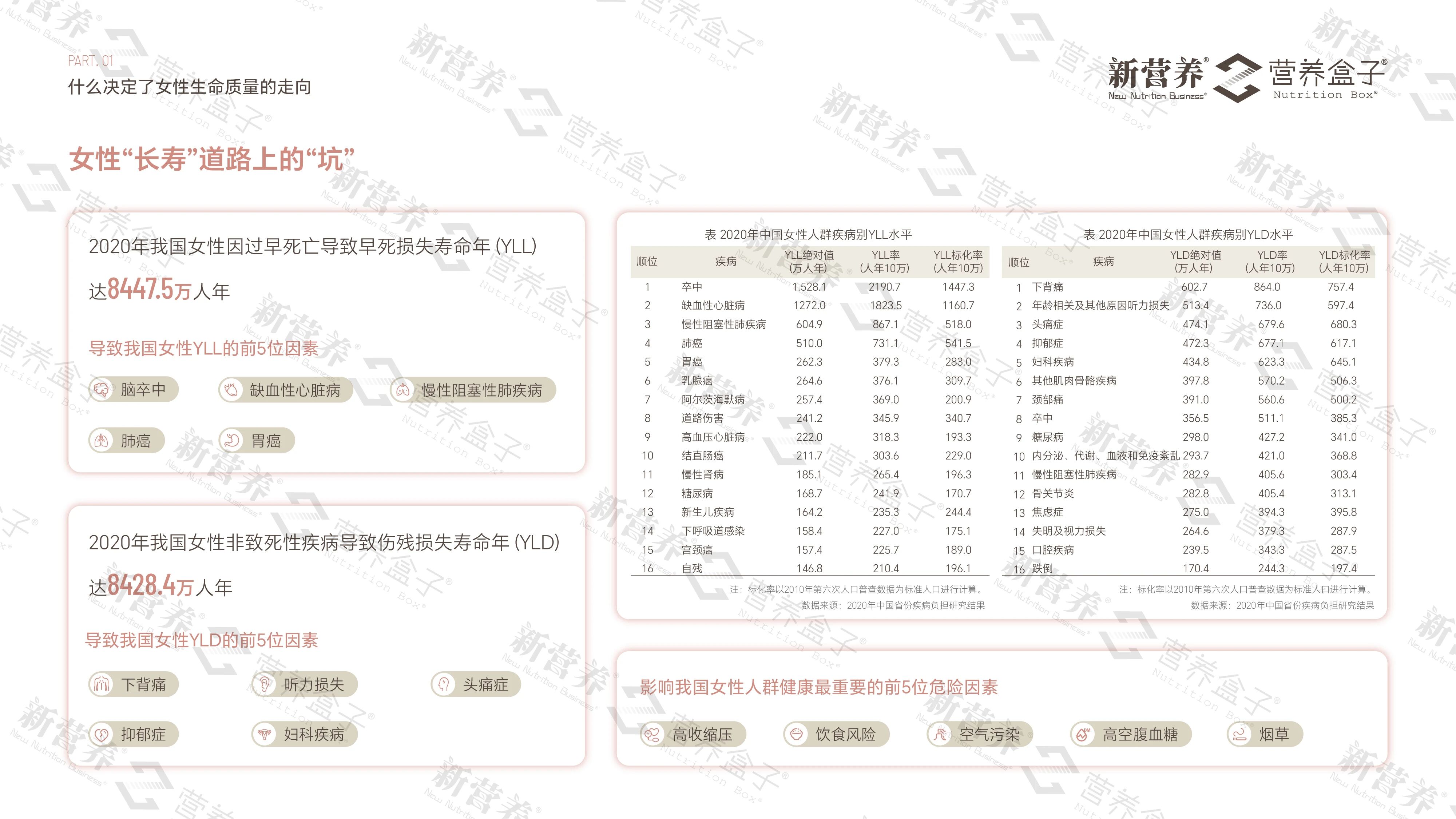 从健康关注点来看,女性以生育为重要分界点,面临多重专属健康挑战。2020年我国女性健康寿命损失呈现双重压力,过早死亡导致的早死损失寿命(YLL)达8447.5万人/年,脑卒中、缺血性心脏病、慢性阻塞性肺问题等位列导致女性YLL的前五位因素;与此同时,非致死性问题导致的致残损失寿命(YLD)达8428.4万人/年,下背痛、听力损失、头痛症、抑郁症、妇科问题成为导致女性YLD的前五位因素。这些数据综合反映出我国女性在生命长度和生活质量维度面临着多元健康挑战,也为后续针对性开展女性健康干预、提升女性整体健康水平提供了关键参考依据。