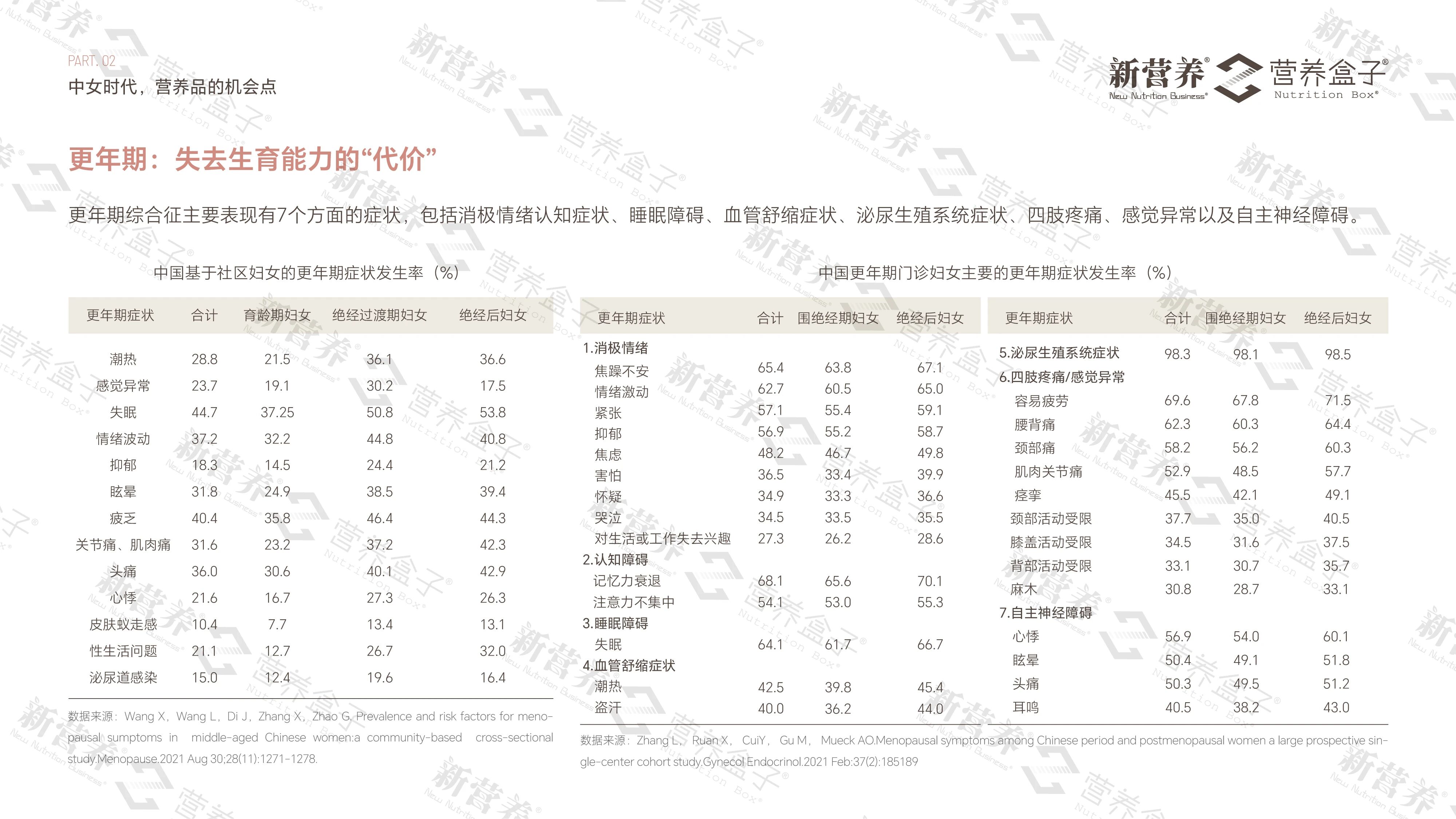 这一庞大群体正催生“中女时代”的营养新需求,而更年期本质是女性失去生育能力后的生理转型,伴随卵巢功能衰退、激素水平下降,带来七大类综合征,其中泌尿生殖系统症状在门诊人群中发生率高达98%,情绪、睡眠、疼痛等问题困扰超半数女性。