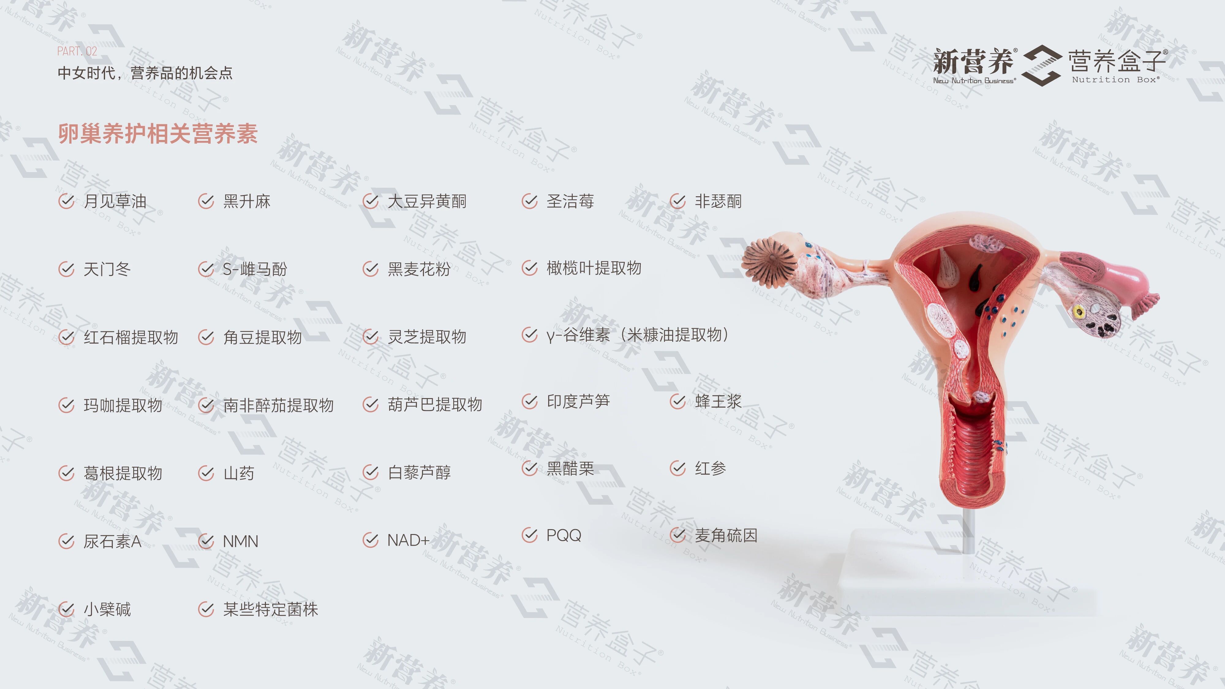 卵巢功能变化是更年期各类表现的核心诱因,围绕激素平衡与细胞状态维护,营养解决方案呈现三大方向:一是植物源性调节成分,如大豆异黄酮、黑升麻、红石榴提取物等,以温和特性为激素平衡提供支持;二是细胞层面养护成分,NMN、NAD+、PQQ、麦角硫因等为细胞活力维持提供助力,适配卵巢状态维护需求;三是菌群调节,特定益生菌菌株可辅助身体代谢,为情绪平稳提供基础支持。