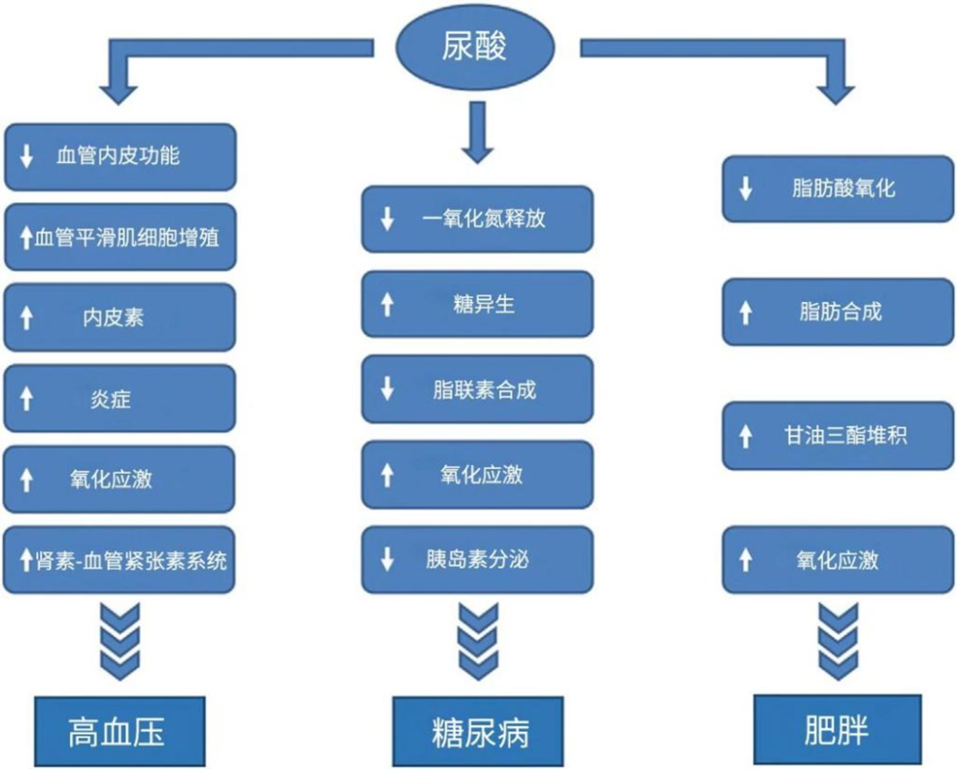 图:尿酸与慢性问题之间可能涉及的一系列机制[2]