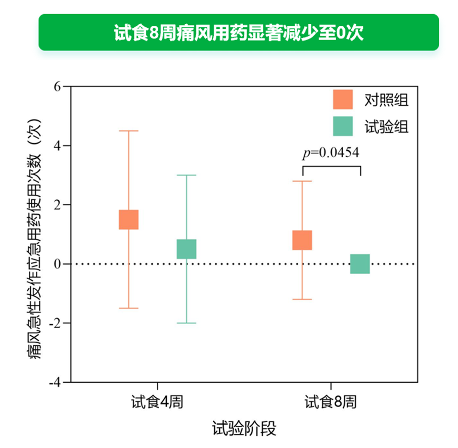 痛风发作次数减少 在痛风防护方面,降小益®乳酸菌粉也表现出显著优势。4周后试验组痛风发作次数相对对照组减少26.67%,发作持续时间减少29.33%;到8周时,发作次数减少46.88%,持续时间缩短69.46%,效果相对提升3.3倍,生活质量得到明显改善。更值得关注的是,在试食4周和8周后,试验组100%的受试者均未因痛风急性发作而使用应急药物;而对照组分别有33.33%和26.67%的受试者需要药物干预,进一步证明降小益在减少药物依赖方面的积极作用。