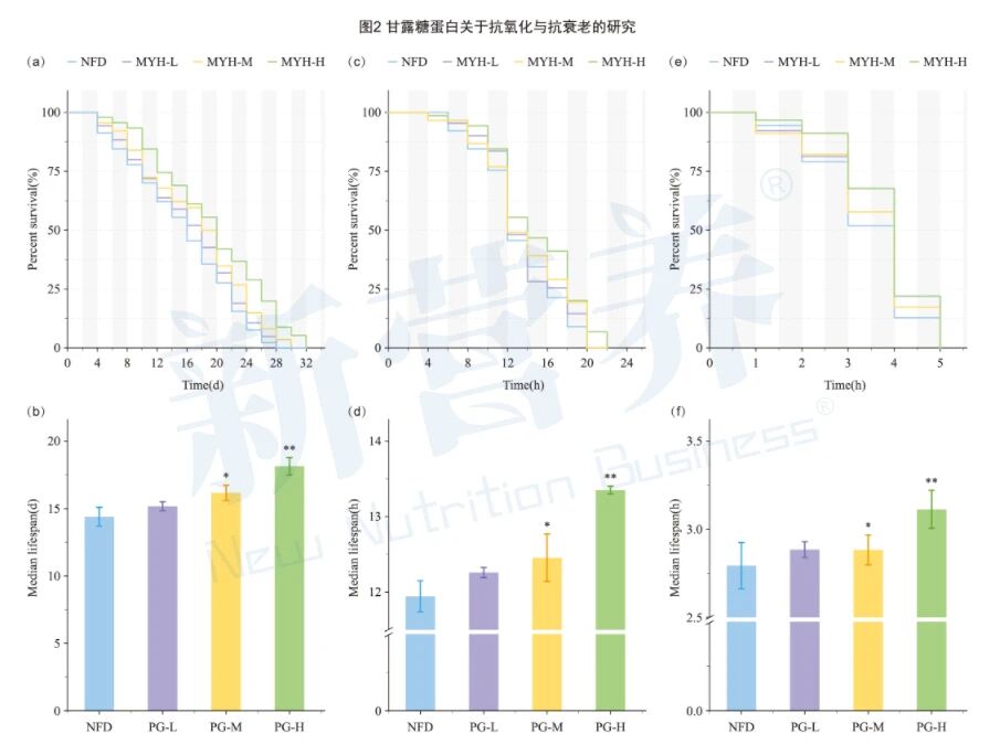 在以“抗衰老模式生物”著称的秀丽隐杆线虫实验中,补充不同剂量的酵母甘露糖蛋白后,线虫的寿命在各种条件下(正常、热应激、氧化应激)均被显著延长。(见图2)