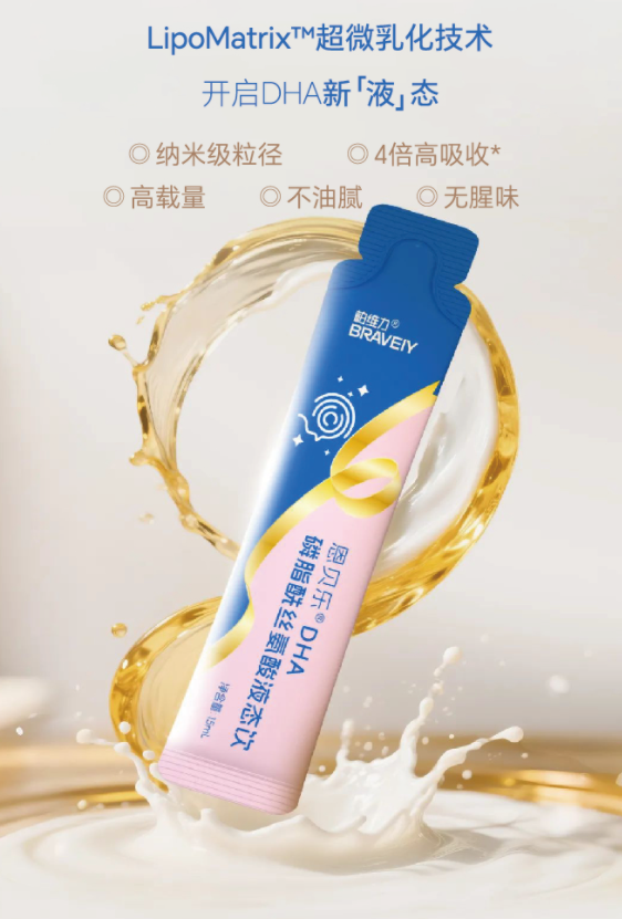 在深入洞察消费需求后,柏维力LipoMatrixTM超微乳化技术利用自研均质乳化工艺构筑纳米级稳态体系,实现水油相超微粒精细均匀分布,将藻油DHA、磷脂酰丝氨酸、核桃肽完美融合,打造出的恩贝乐®DHA磷脂酰丝氨酸液态饮呈现清爽均一的质地。依托风味调控技术平台、敏捷掩味矫味模块,进行了系统化的味蕾测试设计,不仅使产品无腥味、不油腻、赋予了产品柔滑质地和天然口感。