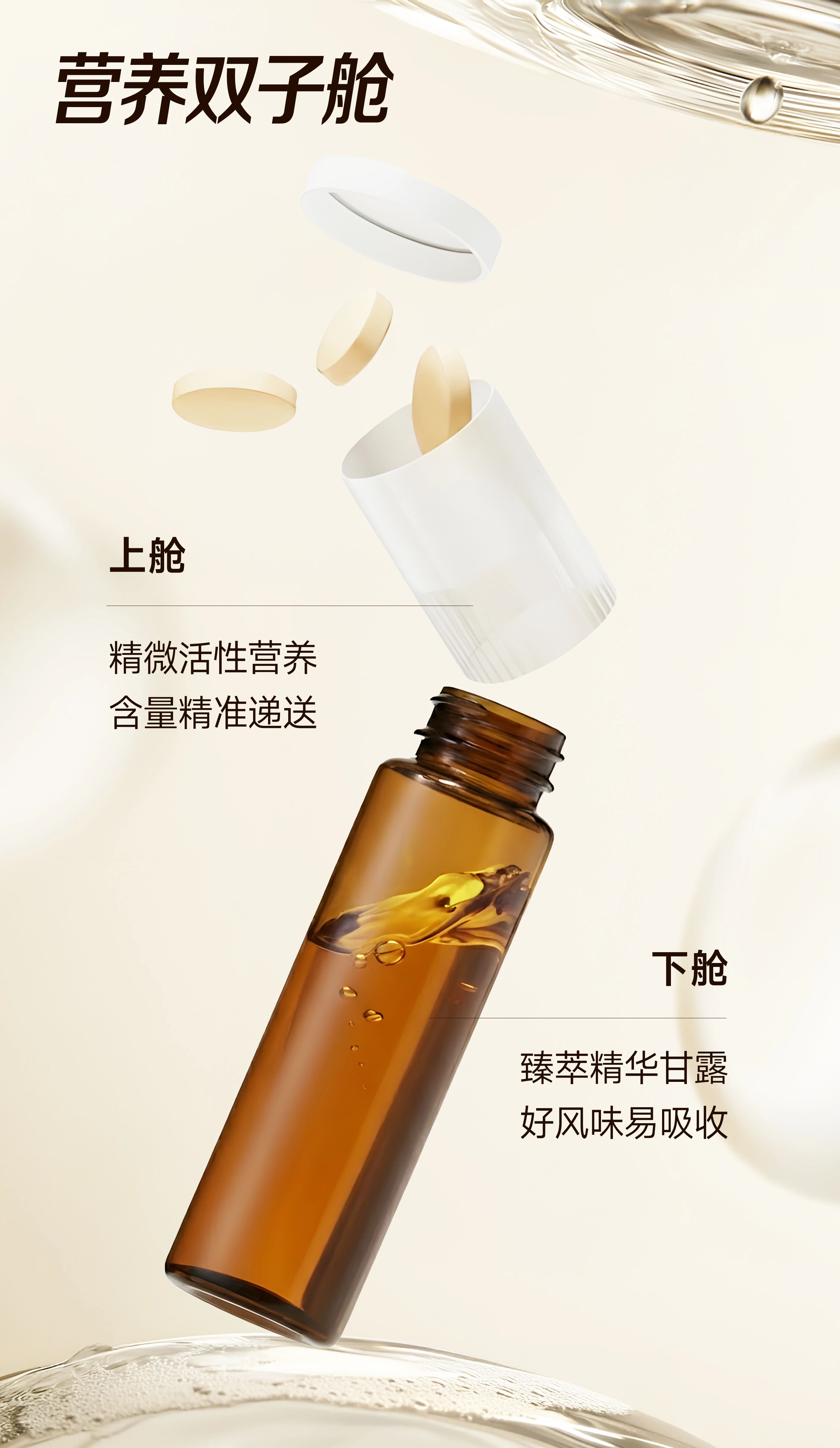 “双舱”剂型的兴起,正是对这一市场趋势的回应。这是一种基于成分保护和营养协同,将两种不同形态、不同功能的营养成分整合于一体的创新性设计。产品分为上舱(粒子舱)与下舱(液体舱)。上舱通常储存难溶于水、效能强但风味差,适用于片剂或软胶囊形态保存的功能营养物质,以保障活性成分的稳定性。下舱承载液态精华等活性成分,提升吸收率的同时带来更佳的风味。