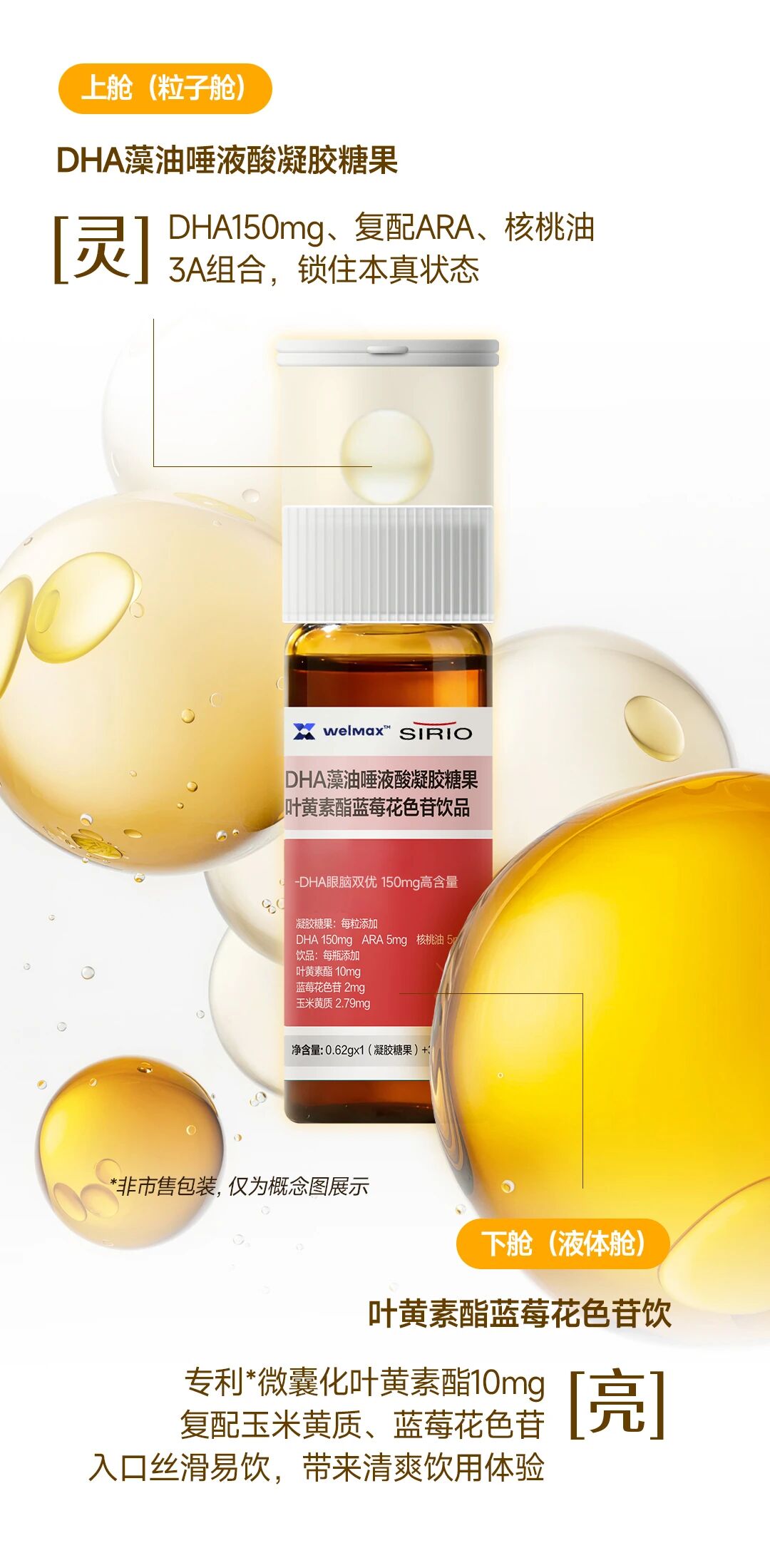 学龄儿童学习压力大、时间长、消耗多,DHA藻油唾液酸凝胶糖果+叶黄素酯蓝莓花色苷饮应运而生。上舱的凝胶糖果以DHA、ARA、核桃油的“3A”组合锁定大脑营养本真状态,下舱优选专利微囊叶黄素酯,复配玉米黄质与蓝莓花色苷,直击眼部健康需求。