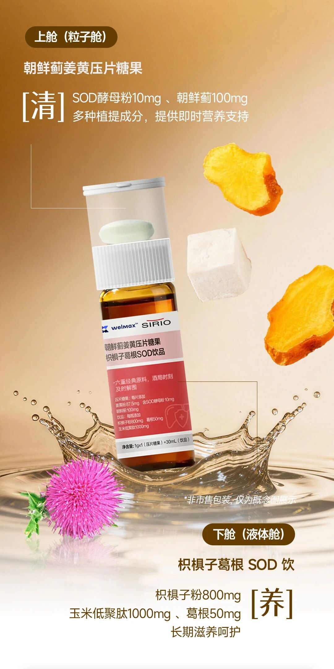 直面社交酒局中的“隐形”营养需求,朝鲜蓟姜黄压片糖果+枳椇子葛根SOD饮强调食药同源成分的科学组合,上舱以朝鲜蓟、姜黄等多种植物提取物成分为主,提供即时天然的营养支持;下舱辅以枳椇子、葛根等成分以食助养,实现“即时呵护+长期滋养”的统一。