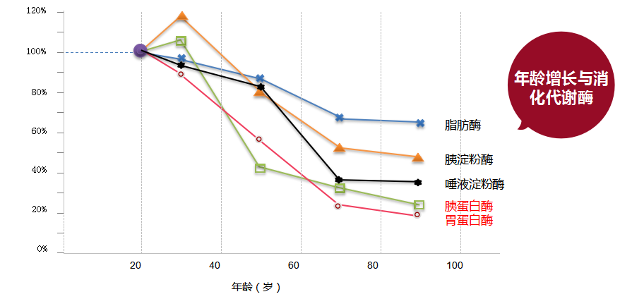 从消化与利用层面分析,年龄增长带来的消化代谢酶活性下滑是核心症结。随着年龄增长,人体多种消化酶活性会显著下降,导致老年人对蛋白质的消化能力削弱。除此之外,老年人还可能因长期用药、胃肠粘膜状态不佳、术后内分泌紊乱等因素,进一步加剧蛋白质“摄入-消化-吸收-利用”全链条的效率损耗。
