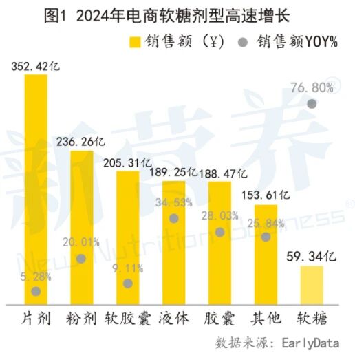 其中,软糖剂型表现尤为亮眼。电商平台2024年数据印证了这一趋势:在所有营养健康剂型中,软糖品类增速领跑全场,同比增幅超76%。