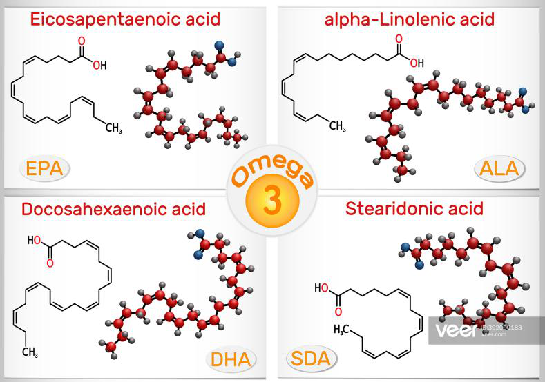 ω-3多不饱和脂肪酸包括α-亚麻酸、硬脂酸、二十碳五烯酸(EPA)、二十二碳五烯酸、二十二碳六烯酸(DHA)。不过,人体自我合成ω-3多不饱和脂肪酸的效率很低,无法满足正常的生理需求。