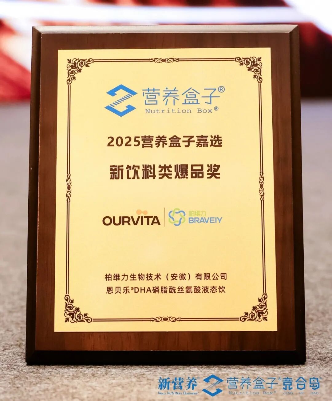凭借配方与剂型的双重创新,恩贝乐®DHA磷脂酰丝氨酸液态饮在举办的2025新营养大会暨营养盒子颁奖盛典上荣膺2025营养盒子嘉选新饮料类爆品奖,为DHA新品开发树立了创新典范。