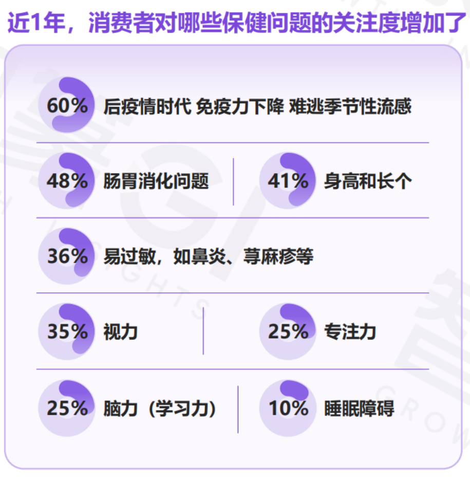 后疫情时代,全民健康意识显著升温,主动健康管理成为主流。调研数据显示,近1年,消费者对免疫力及延伸出的相关身体问题关注度增加,如季节性流感、肠胃消化、易过敏等[1]。消费者对于提升身体抵抗力的需求愈发迫切,尤其是在秋冬季节,腹泻等肠胃问题频发,让家长们忧心不已,提升孩子身体抵抗力的需求愈发迫切。