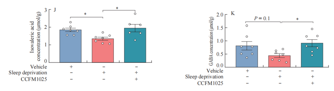 江南大学的科研团队曾进行了一项关于 CCFM1025 对睡眠剥夺小鼠影响的研究。研究人员将实验小鼠分三组(对照组、模型组(睡眠剥夺)、益生菌组(睡眠剥夺+CCFM1025))适应一周后进行干预一周。结果显示,补充CCFM1025逆转了睡眠剥夺小鼠的认知障碍,显著改变了肠道微生物组成和基因组功能。还确定了可能调节睡眠功能的关键微生物代谢物,如肠道中的异戊酸和γ-氨基丁酸以及血清中的嘌呤代谢物(图1)。总的来说,CCFM1025的干预或通过调节肠道微生物群及其代谢物影响了认知障碍和昼夜节律紊乱[1]。