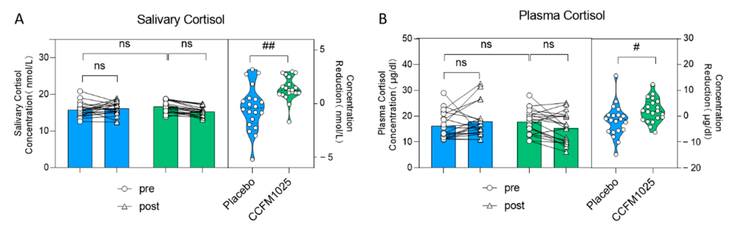 此外,另有一项临床研究以40位患有选择应激性失眠的受试者与20位健康受试者为研究对象,进行为期4周的临床干预,评估CCFM1025对受试者睡眠状态的影响[2]。结果显示,健康对照组和睡眠障碍组在匹兹堡睡眠质量指数(PSQI)评分、阿森斯失眠量表(AIS)评分及生理指标皮质醇水平上存在显著差异,这些结果证实了我们失眠评估方法的可靠性。CCFM1025干预4周后,受试者PSQI评分、PSQI睡眠质量评分、PSQI睡眠障碍评分以及AIS评分均得到显著降低,表明CCFM1025可通过提升参与者的主观睡眠质量和减少睡眠障碍,对睡眠质量产生正向影响(图2)。此外,与对照组相比,益生菌组受试者唾液皮质醇和血浆皮质醇浓度显著降低(图3);相比于干预前,益生菌组受试者的大豆黄酮相对丰度显著增加,表明CCFM1025可提高血清中大豆黄酮含量,降低影响睡眠的应激标志物,从而支持睡眠质量。
