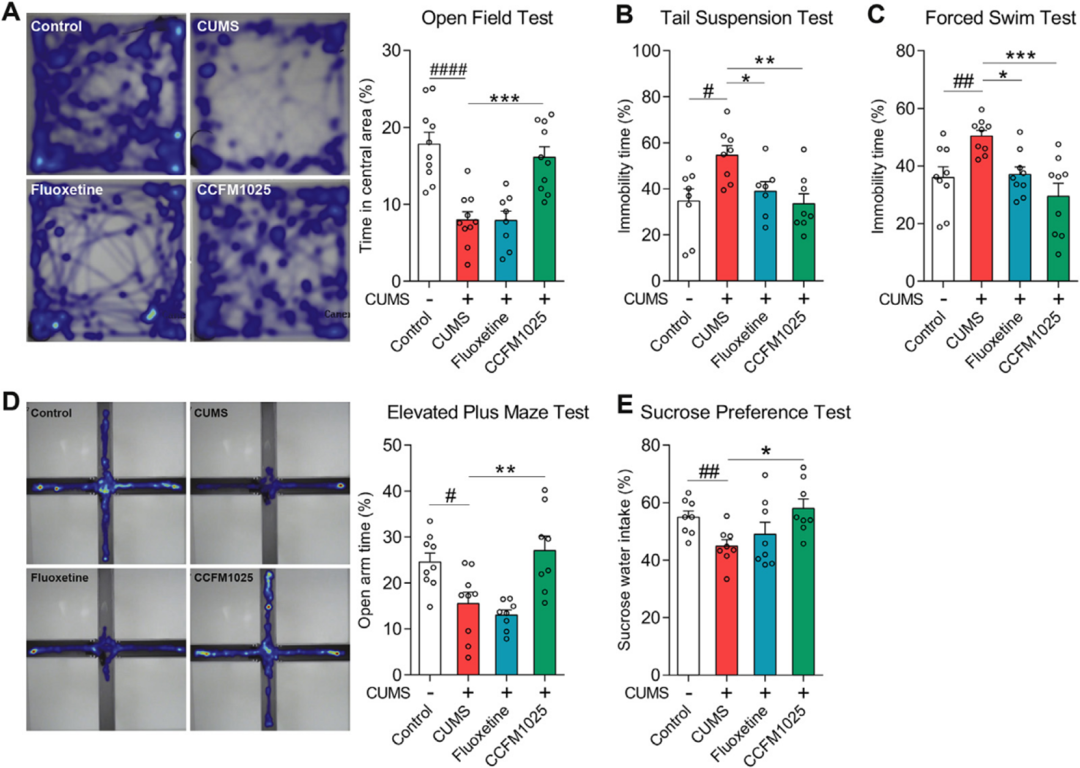图4 CCFM1025的抗抑郁样和抗焦虑作用
