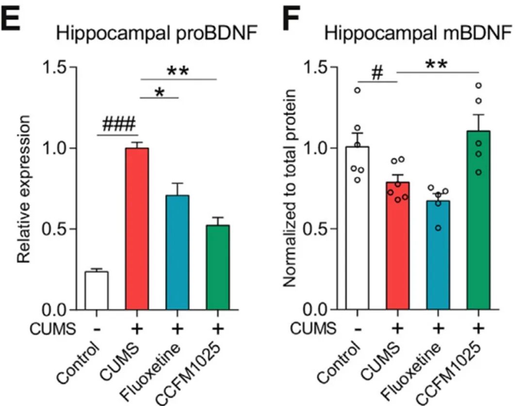 CCFM1025在调节情绪方面展现出了令人瞩目的功效。江南大学的科研团队在对CCFM1025 进行深入研究时发现,它能够有效缓解焦虑和抑郁。在一项动物实验中,将40只六周大的C57BL/6小鼠(公鼠),随机分为四组 (每组10只):一组为未诱发抑郁症状的正常控制组、另外三组为慢性压力诱发抑郁症状的小鼠(其中一组不服用益生菌、一组服用抗抑郁药、一组服用益生菌),持续干预五周。结果显示,CCFM1025显著减轻了小鼠的焦虑和抑郁样行为(图4),通过调节糖皮质激素受体(Nr3c1)的表达,有效缓解了下丘脑-垂体-肾上腺的过度活跃反应及炎症反应。此外,还可上调脑源性神经营养因子(BDNF)的表达,使proBDNF/BDNF水平的平衡恢复至对照组水平(图5);同时恢复压力诱导的肠道微生物群异常;提高抑郁小鼠肠道5-HTP、血清5-HTP和海马体5-HT水平(图6),表明短双歧杆菌CCFM1025能在微生物群-肠道-大脑轴的多个层面起效,有效对抗慢性压力引发的焦虑和抑郁[3]。