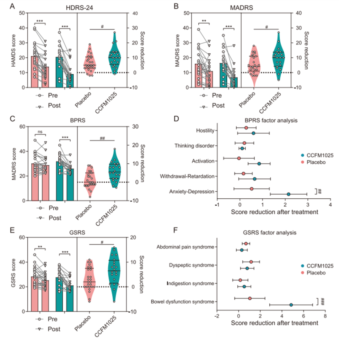 此外一项有关CCFM1025混菌对于抑郁症患者的临床研究同样表明:联合益生菌疗法能有效缓解重度抑郁症患者的抑郁和胃肠道症状,保护神经可塑性,支持肠道蠕动[5]。