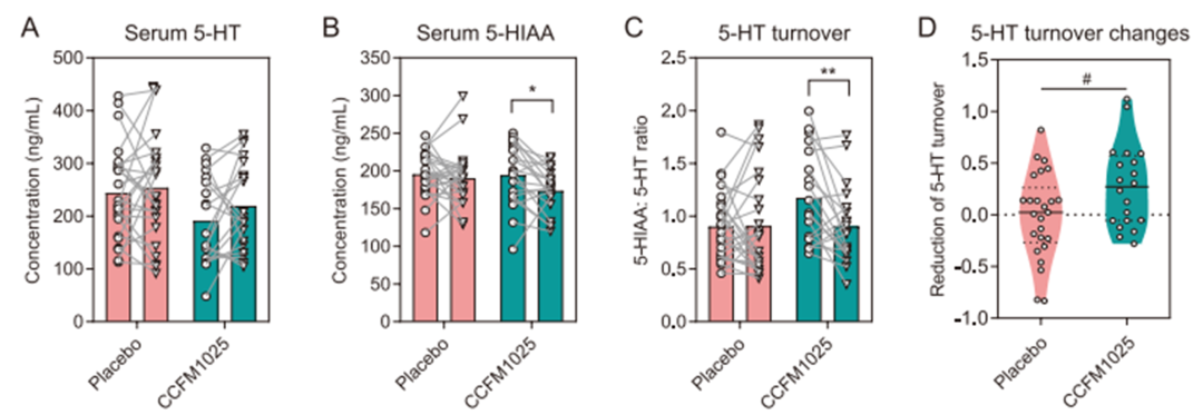 不仅如此,CCFM1025 支持睡眠的作用在临床试验中也取得了积极的成果。该临床研究与中国盐城市汀湖区人民医院合作,选择45名重度抑郁症患者,随机分为安慰剂组和益生菌组。安慰剂组食用麦芽糊精,益生菌组食用短双歧杆菌CCFM1025(100亿CFU/天),连续食用4周后,进行一系列检测评估。结果表明:CCFM1025能有效降低抑郁量表和胃肠道症状量表评分(图7),降低血清中5-HT周转率(图8),提升肠道中色氨酸代谢产物含量和肠道益生菌丰度(图9),有助于缓解抑郁症状[4]。