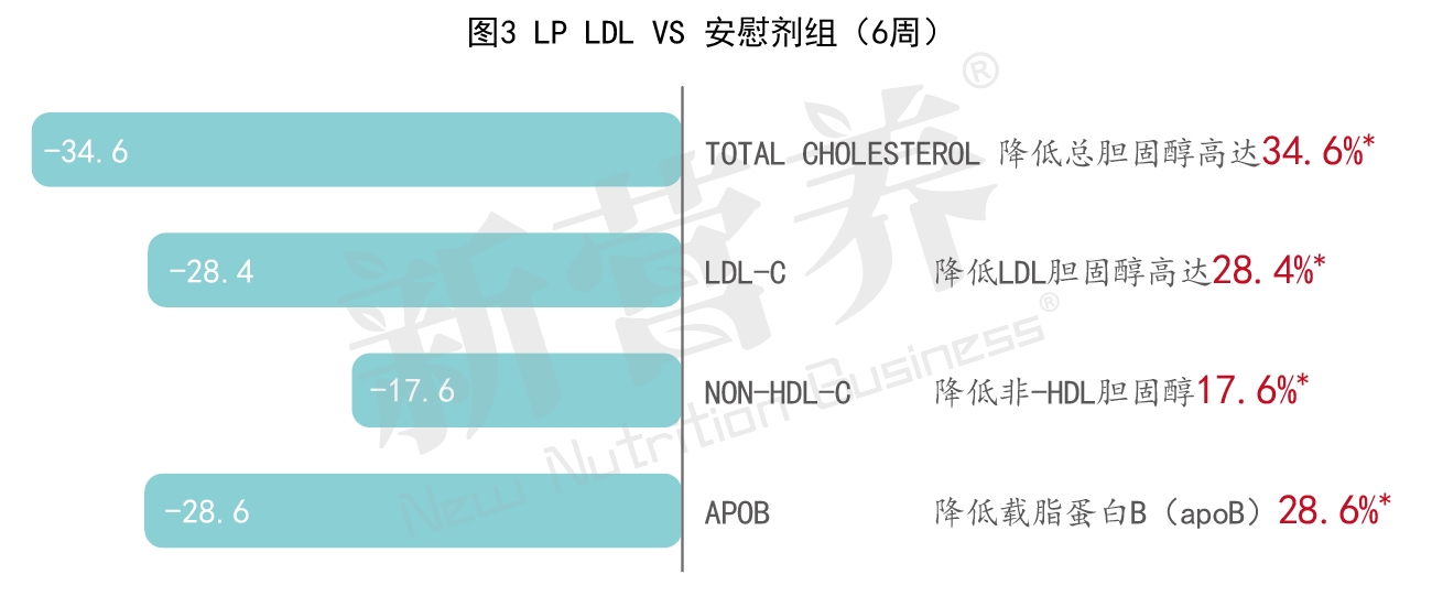 植物乳植杆菌LP LDL的卓越能力经过了全球多所科研机构开展的多次随机、双盲、安慰剂对照研究验证,证实其对胆固醇的调节效果显著且稳定,可降低多种心脏代谢生物标志物:一项临床研究中[11],每日服用推荐剂量植物乳植杆菌LP LDL的受试者,总胆固醇水平平均下降 34.6%,非高密度脂蛋白胆固醇降低17.6%,低密度脂蛋白胆固醇水平显著降低28.4%,载脂蛋白B(LDL-C的“运输载体”)降低28.6%。这意味着,不仅“坏胆固醇”的总量减少,其在血管内的“运输能力”也显著下降。
