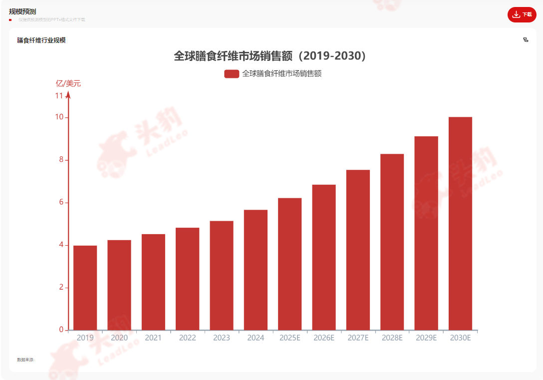 受健康意识提升、消费需求增加、食品工业创新以及中国市场的强劲驱动,全球膳食纤维市场规模正在不断扩大,2023年全球膳食纤维市场销售额达到5.14亿美元,预计2030年将达到10.03亿美元,年复合增长率(CAGR)为10.03%。从消费层面看,中国已成为全球最大的膳食纤维消费市场之一。