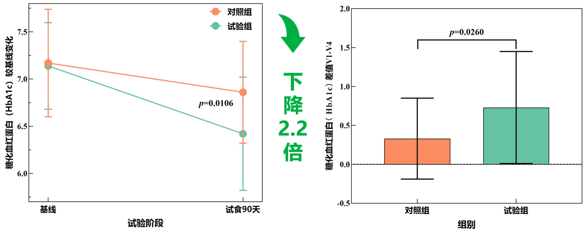 在核心降糖指标上,试验组补充降小益®后糖化血红蛋白(HbA1c)从基线7.14%降至6.42%,降幅达0.73%,是对照组的2.2倍,组间差异显著(P=0.0260);试验组HbA1c达标率(<7.0%)高达80.95%,意味着绝大多数受试者实现了血糖控制目标。与此同时,试验组受试者的空腹血糖持续下降,90天时均值降至6.62 mmol/L,显著低于对照组的7.12 mmol/L;餐后2小时血糖在干预中期(60天时)就已低于对照组(9.04 vs 11.07 mg/dL,P=0.0024),实现全天候平稳控糖。