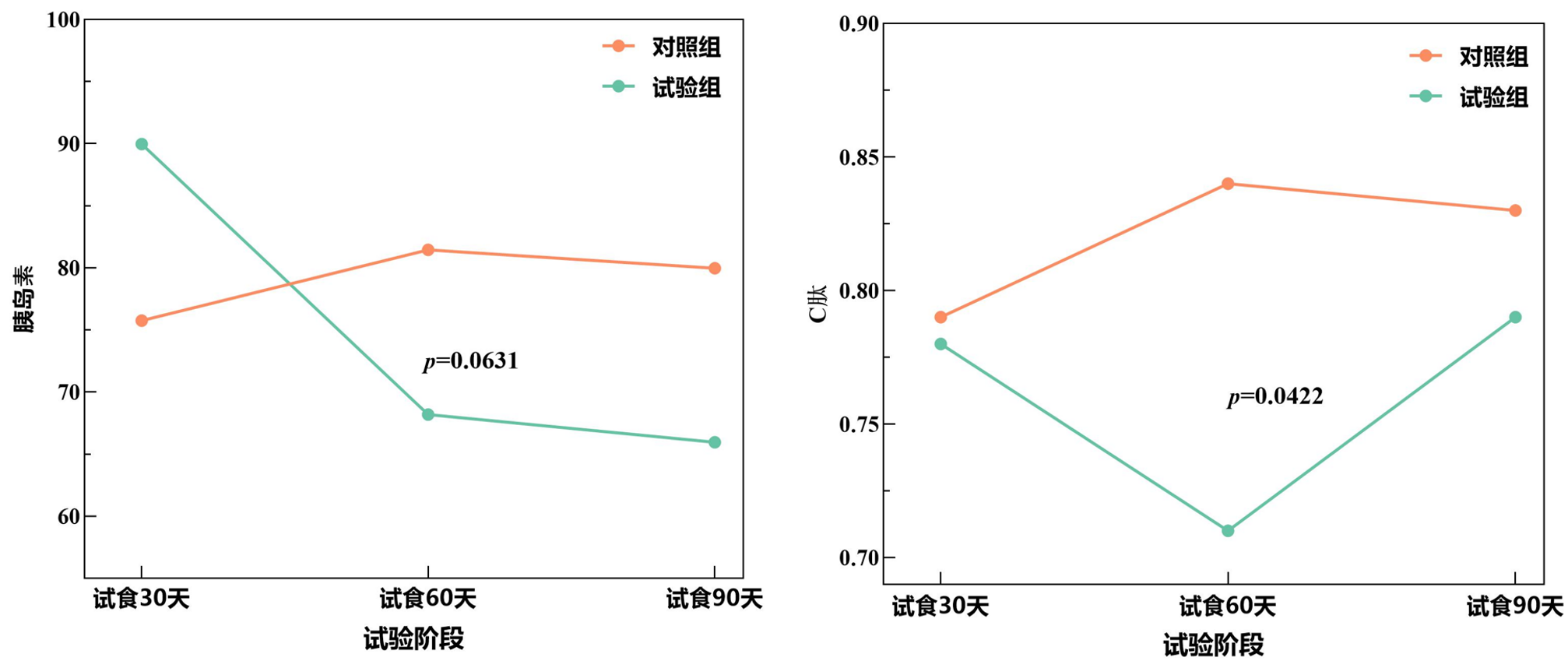 胰岛素抵抗是Ⅱ型糖尿病的核心危险因素。试食60天后,试验组HOMA-IR指数显著降低(2.90 vs 3.69,P=0.0433);胰岛素和C肽水平也呈现出积极趋势,均低于对照组(C肽试验组0.71 vs 对照组0.84,P=0.0422),表明机体胰岛素敏感性大幅提升,无需分泌过多胰岛素即可控制血糖,为胰腺“减负”。