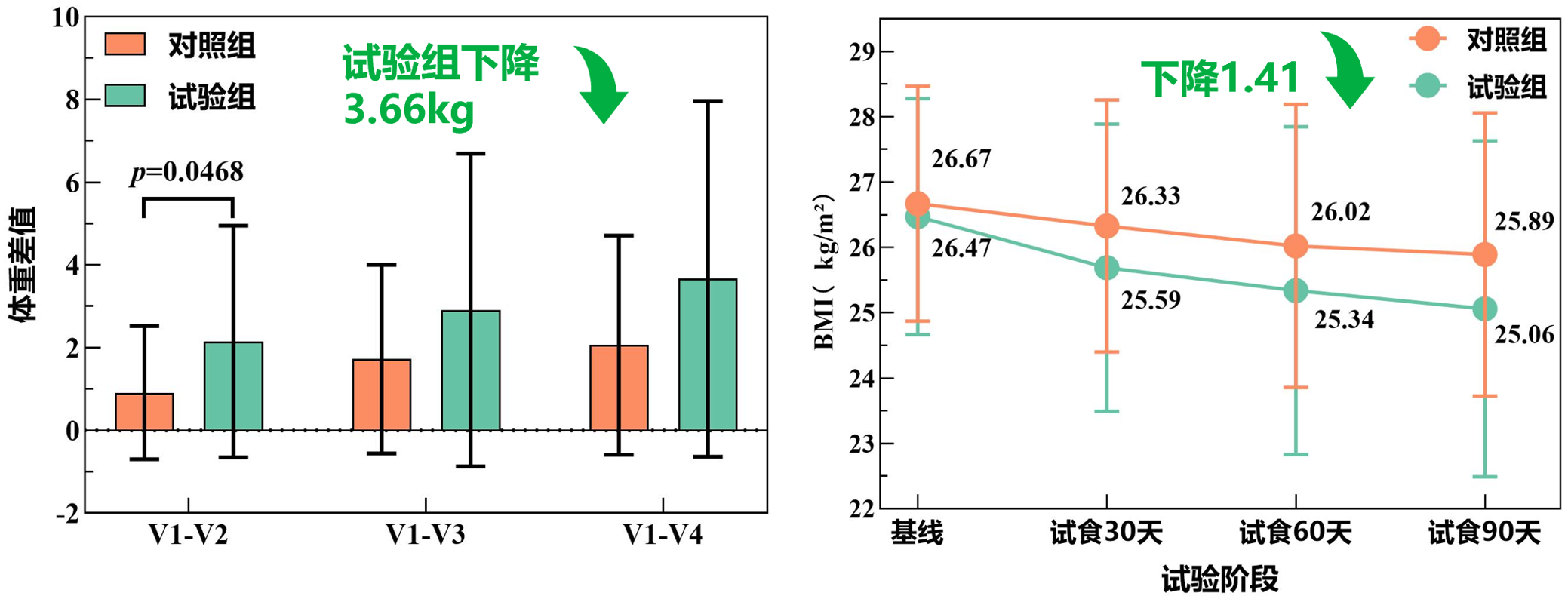 更意外的是,降小益®SugaRite™乳酸菌粉在体重管理与血脂改善方面也颇显优势。90天的干预周期里,试验组体重从基线72.55kg降至68.77kg,平均降低3.66kg,BMI从26.47降至25.06,降幅达1.41。统计数据显示,试验组BMI达标率(<24.0 kg/m²)达33.33%,显著高于对照组的10.71%,三分之一受试者成功回归健康体重。同时,补充降小益®还降低了“坏”胆固醇和载脂蛋白B的水平,为心血管健康提供额外保护。